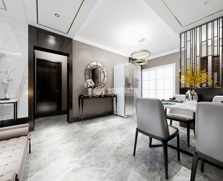 利用吊棚的設(shè)計來進(jìn)行客餐廳的分區(qū),大方得體在餐廳上方的吊棚進(jìn)行了處理,吊棚的寬度和餐桌的寬度一致,在 設(shè)計上講究呼應(yīng),會讓業(yè)主有一個輕松愉快的場所。