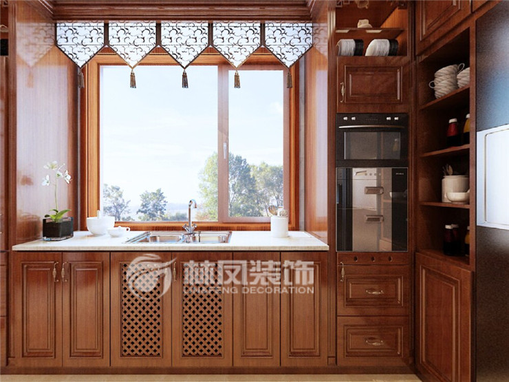 敞開區(qū)域整體采用濃厚的櫻桃木搭配家具風格,細膩的紋理、突出的顏色,更能彰顯中式的獨特情懷。玄關(guān)處月窗搭配迎客松,禪意十足??筒蛷d整體硬裝部分秉承中式對稱結(jié)構(gòu),高于一般住房的舉架更能有力的表達斗拱屋檐的中式結(jié)構(gòu)。地面拼裝灰色石材,襯托出中式的宏偉與張力。