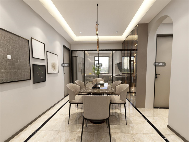 餐廳采用了長桌設(shè)計(jì),理石材質(zhì)桌面與背景墻和地面相呼應(yīng),餐廳同樣設(shè)置了玻璃門酒柜,在燈光點(diǎn)綴下酒具的質(zhì)感展現(xiàn)的更加完美。