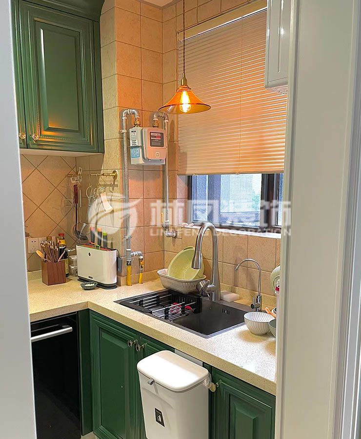 廚房說(shuō)明: 廚房是一個(gè)做飯儲(chǔ)物清潔的一個(gè)場(chǎng)所,雙排櫥柜,洗菜盆放在窗下,刷碗到時(shí)候空氣流動(dòng)性比較好,也可以觀察園區(qū)的環(huán)境,另一邊擺放煙機(jī)灶具,中間可以放一個(gè)菜板,洗完菜之后切菜,然后炒菜,動(dòng)線合理,棚頂選擇鋁扣板的吊頂,好清潔。