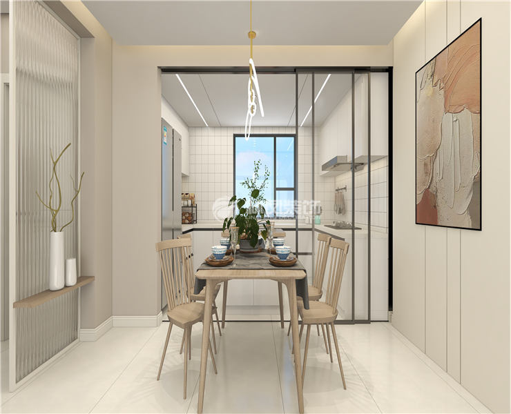 餐廳設(shè)計說明:餐廳墻面采用膚感硬包,與墻面的微水泥融為一體,左面為進(jìn)戶長虹玻璃隔斷,光影重疊有種浪漫的感覺。