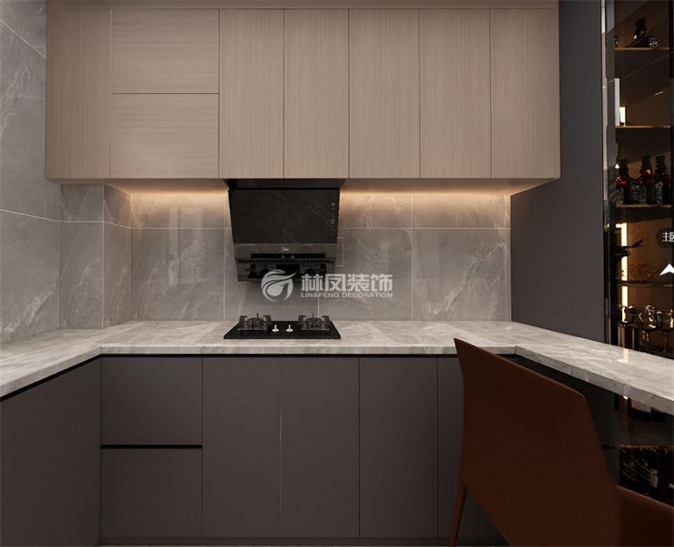 餐廳說明:開放式廚房讓整個空間更加有整體性,與客廳空間連貫,讓整個空間更加明亮寬敞,餐桌設計與廚房臺面一起定制,通過臺面延伸出來,增加了臺面使用空間的同時也使廚房空間更加大氣,大理石吧臺讓輕奢元素體現(xiàn)的淋漓盡致。