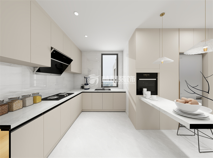 廚房說明:對于廚房的設(shè)計,以實用性為主,采用米色櫥柜,滿足了客戶需求,利用島臺連接客廳,使廚房不那么單調(diào)。