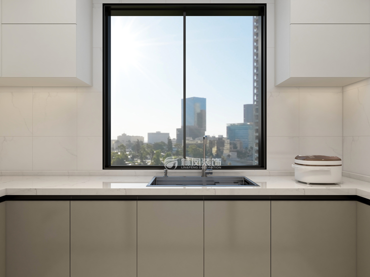 廚房說(shuō)明:U型廚房根據(jù)人體力學(xué)原理,動(dòng)線(xiàn)合理便捷,形成高效的黃金三角位,即“洗切炒流水作業(yè)”。