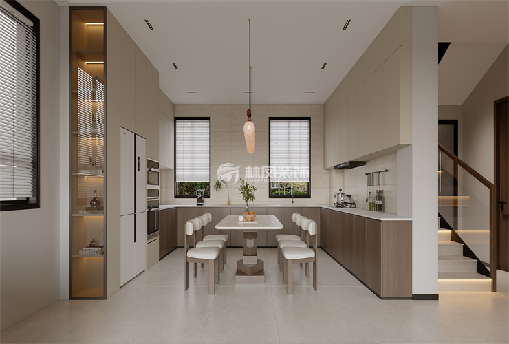 廚房說明:U性臺的設(shè)計滿足了客戶對大廚房的需求,嵌入式冰箱和大面積的櫥柜增加了收納空間,并設(shè)有6人位餐桌,可多人聚餐,實現(xiàn)空間合理化。