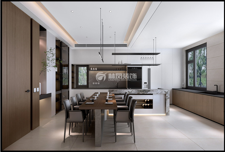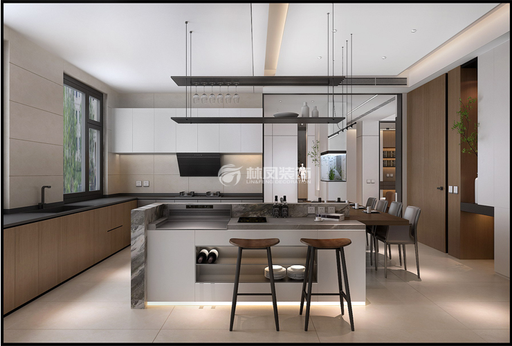半開放式布局方式讓廚房和餐廳融為一體,打破傳統(tǒng)餐廳的沉悶。L型廚房設(shè)計,洗切炒動線流暢靈活