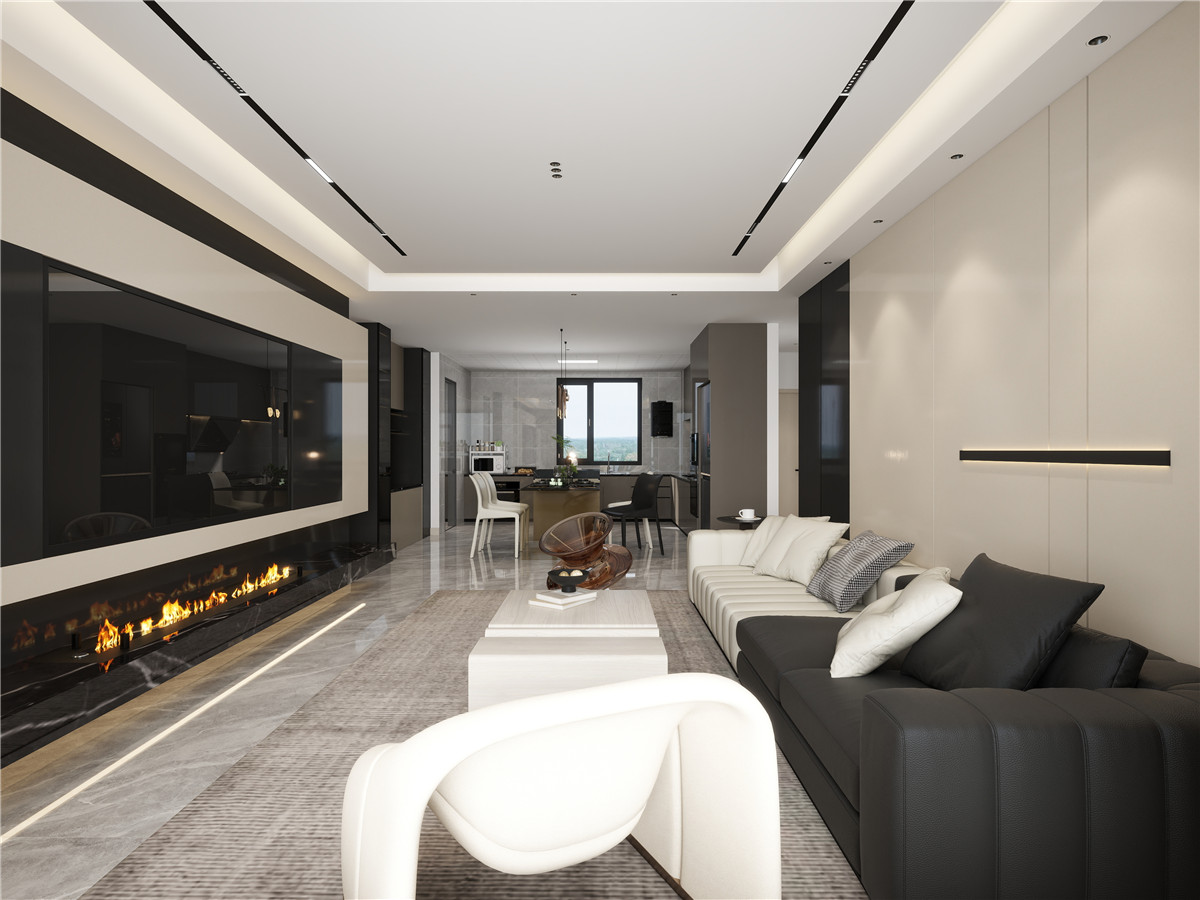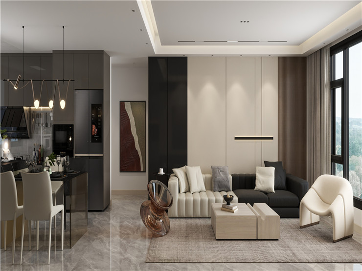 客廳采用了用護(hù)墻板做沙發(fā)背景墻,及內(nèi)嵌電視柜的設(shè)計(jì),客廳的天花采用了懸浮頂無(wú)主燈,營(yíng)造了舒適安逸的氛圍感,電視及沙發(fā)兩側(cè)的小山丘型筒燈打光使日常生活更添樂(lè)趣。