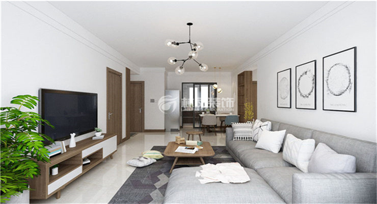 客廳整體采用白墻為主,暖白色地磚,茶幾、電視柜和門選用原木色為主,突出北歐風(fēng)格的元素特點,地面塊毯與沙發(fā)顏色搭配,通過顏色進行分區(qū)。