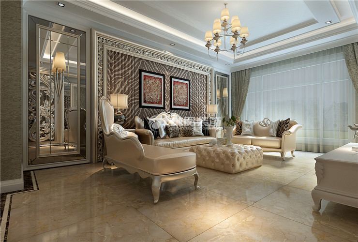 業(yè)主比較喜白色系設(shè)計(jì)效果,喜歡歐式風(fēng)格獨(dú)有的曲線線條美感,整個(gè)客廳空間的理石地磚鋪貼以及背景墻特殊的造型和鏡面的使用使空間地面華麗立體感強(qiáng)烈,配合上一部分淺色金箔色彩的家具讓整個(gè)空間更加靈動(dòng),華麗,更加美感。
