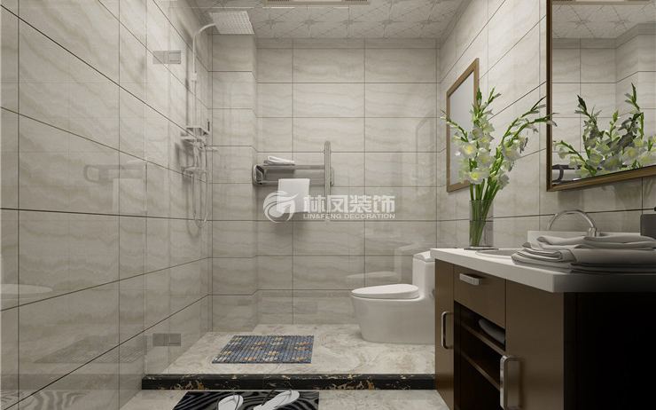 衛(wèi)生間墻地磚選擇灰色系列的磚給人帶來的是一種溫馨,浴屏的獨特設計分開了空間的干濕分離,體現(xiàn)出了客戶的高大上。