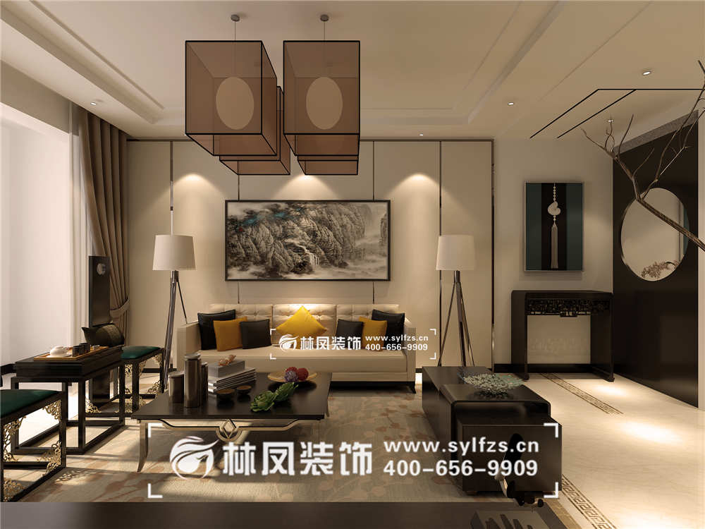 設計理念:本案新中式體現(xiàn)的是現(xiàn)代和中式的文化碰撞,本案大膽運用了藍綠色的壁布,地王黃色的抱枕相對呼應,舊木色的家具沉穩(wěn)大氣,天花的線條凸顯整體的現(xiàn)代感