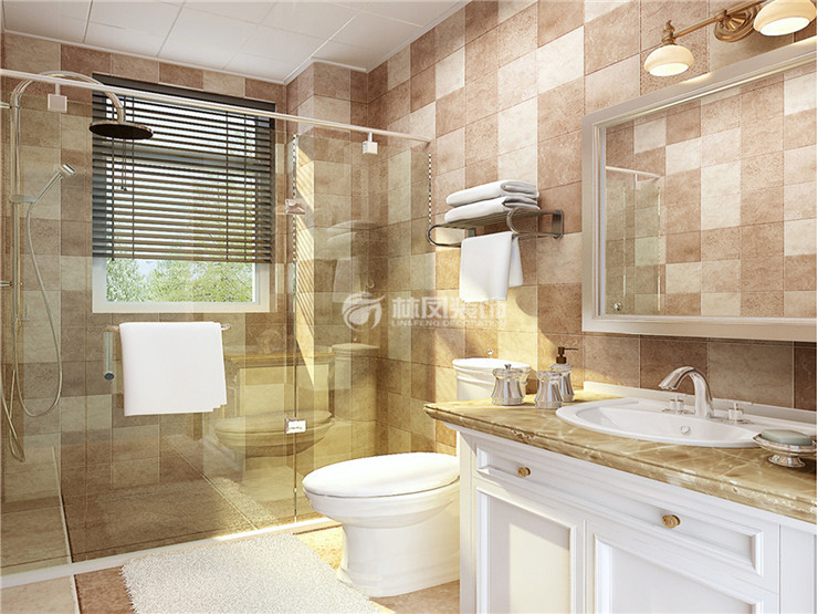 磚石鋪貼了一個大氣的衛(wèi)浴間,盥洗盆和收納柜合二為一,選擇了仿古的墻磚并不單調(diào)。