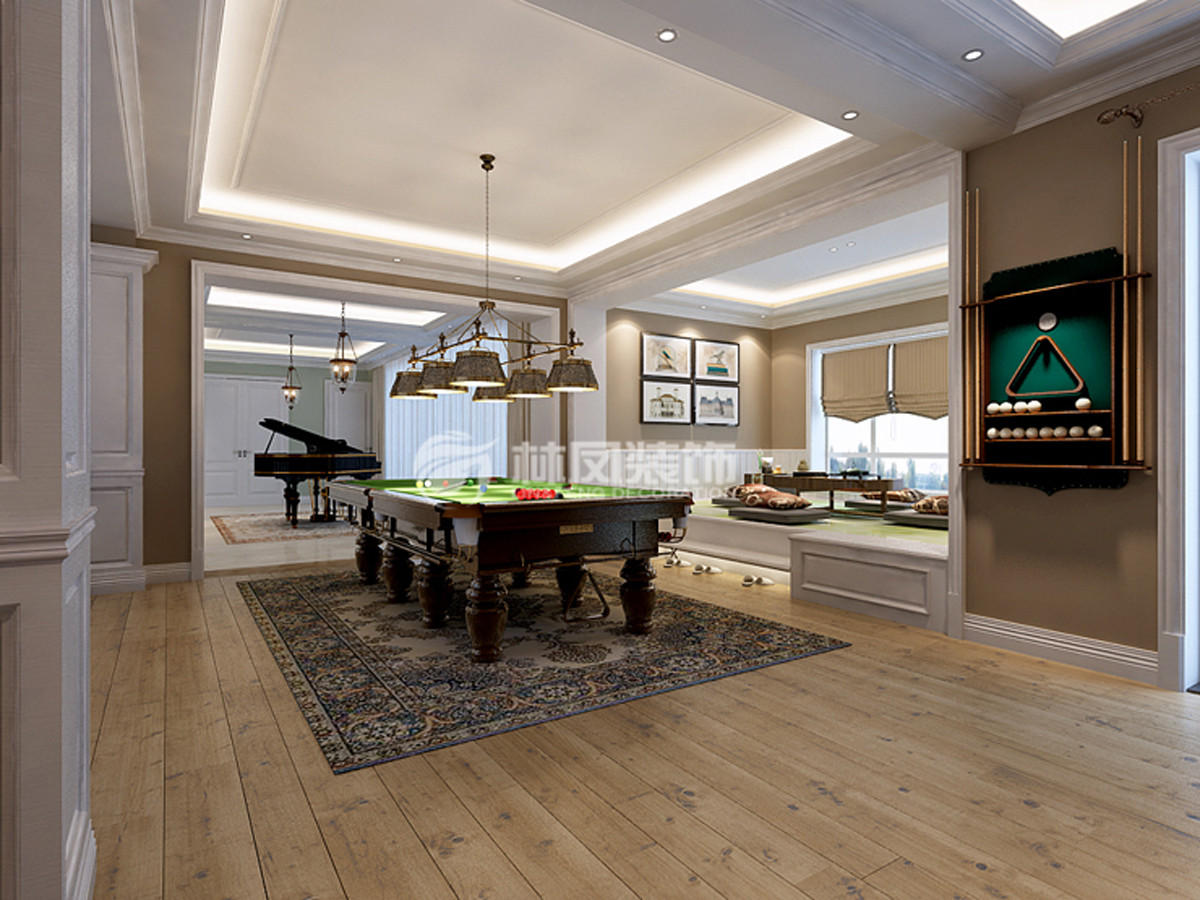 三室兩廳一廚兩衛(wèi),高層整體采用美式風(fēng)格,色調(diào)以深色為主,體現(xiàn)美式的居家感和溫馨感。