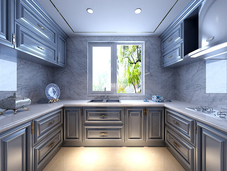 廚房設(shè)計(jì)為U型設(shè)計(jì),櫥柜則采用淺藍(lán)色系柜體,墻面則采用理石紋理瓷片,整體格局顯現(xiàn)出一份寬敞舒適的感覺。