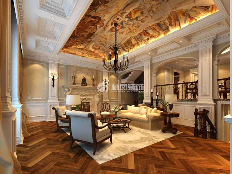 設(shè)計理念:該案設(shè)計采用迷情法爾賽設(shè)計風(fēng)格,藝術(shù)與時間的雕琢,華貴與空間的妝點,靈魂與人生的交錯,締造出一個藝術(shù)殿堂。對原有建筑結(jié)構(gòu)的理解與修改,利用現(xiàn)有的結(jié)構(gòu)空間加以修飾,使其建筑結(jié)構(gòu)更加豐富多彩。穹頂壁畫與造景的窗畫使空間的得到了藝術(shù)的升華。