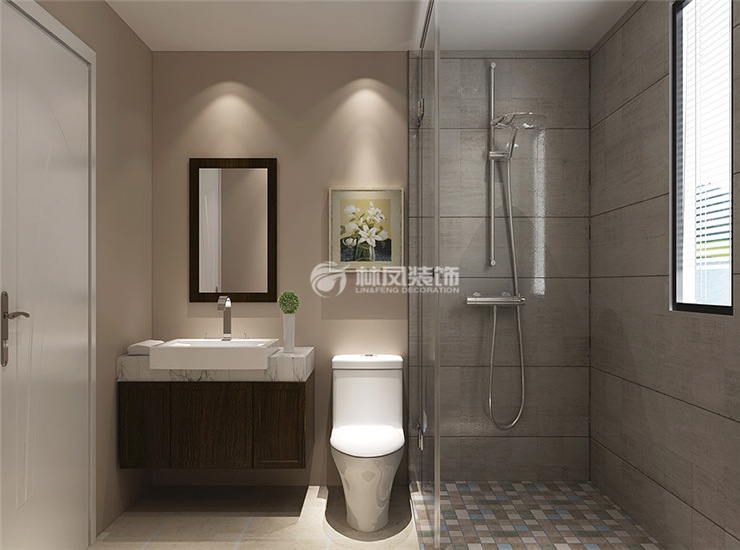 主要使用素色的乳膠漆以及墻磚,沒有過多的飾品,加之頂棚的筒燈,使得衛(wèi)生間顯得更加和諧。