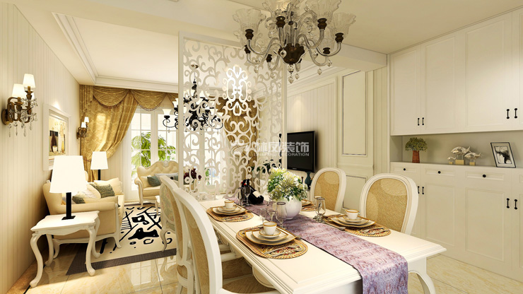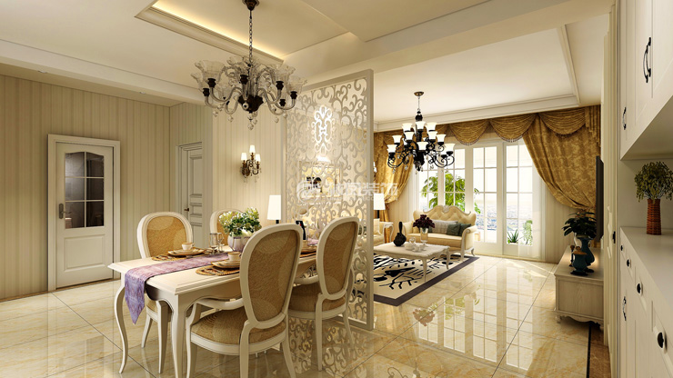 客廳與餐廳用鏤空裝飾隔斷隔開,劃分出餐廳了區(qū)域,豐富的鞋柜和衣柜滿足了主人日常的起居需求,更將空間層次突顯的淋漓盡致。餐廳將鏤空隔斷作為餐廳背景,放大空間的同時(shí),將歐式奢華而藝術(shù)的特點(diǎn)深深的印刻在整個(gè)空間的每一處。