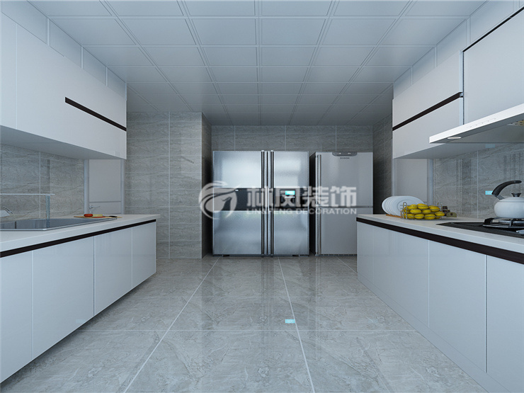 廚房形成一個半開放式的。地面彩用的是灰顏色的拋光磚,整體櫥柜顏色干凈整潔,顯得整個空間干凈利落.