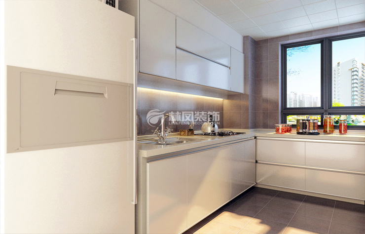 廚房整體灰色瓷磚,配上白色櫥柜的廚房是女主人的活動空間,那么在色彩上做出了溫馨的感覺,主人的小資生活會更品味舒適。