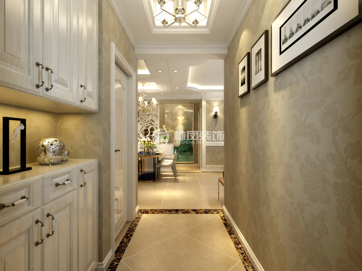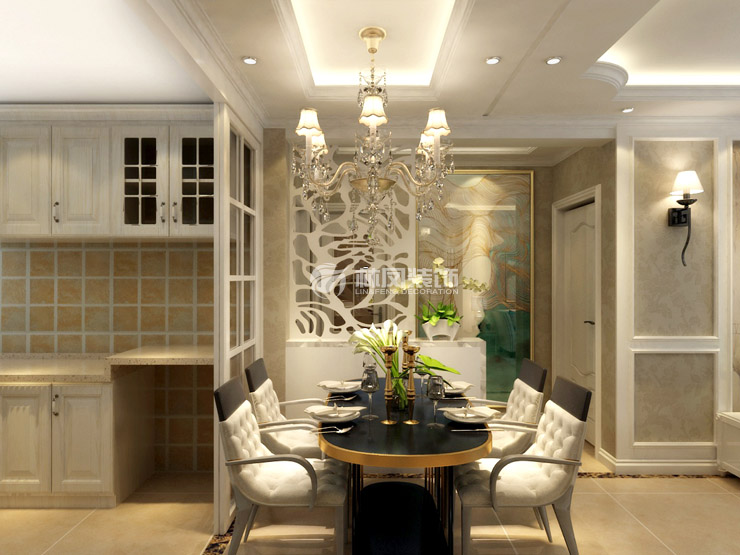 設計理念:本案是現(xiàn)代簡約歐式風格,采用歐式經典石膏線,壁紙,護墻板等材質,棚面運用石膏板吊棚做出區(qū)域劃分,讓整個空間的照明更柔和,棚面的點光源和燈帶讓空間的氛圍光更突出。