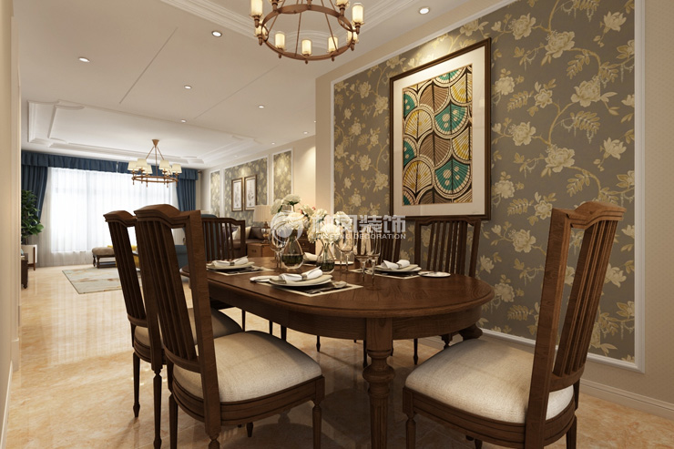 本案的客廳美式純皮頭沙發(fā),搭配質(zhì)地溫馨的仿古地磚以及電視背景墻的護(hù)墻板,將美式帶入家中,其他吊棚及布局還偏向簡約,讓業(yè)主真正實(shí)現(xiàn)輕裝修重裝飾的完美體驗(yàn)。