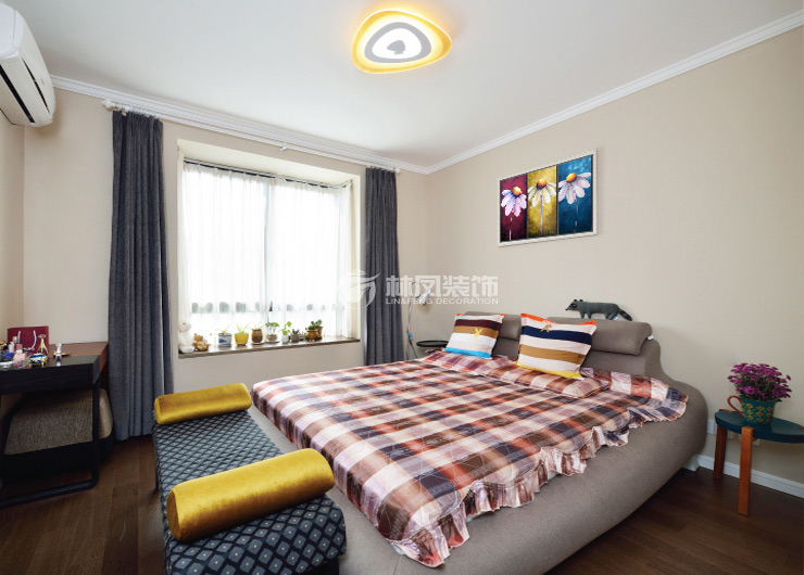 主臥為女主人設(shè)計梳妝臺,床上則是用上業(yè)主父母贈送的床品,床頭兩邊圓幾上的植物,與床頭掛畫和花型吊燈互為點綴,讓本為簡單的臥室,變得更有生機。