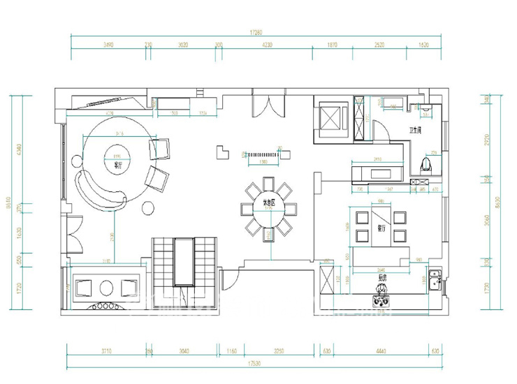 餐廳的位置兼顧了客廳和廚房的中心。餐廳的空間使用了簡(jiǎn)潔的圓桌代替了普通的方桌。餐椅的搭配兼顧了客廳的沙發(fā)顏色做了搭配。所有的動(dòng)線空間也都做了更好的銜接。