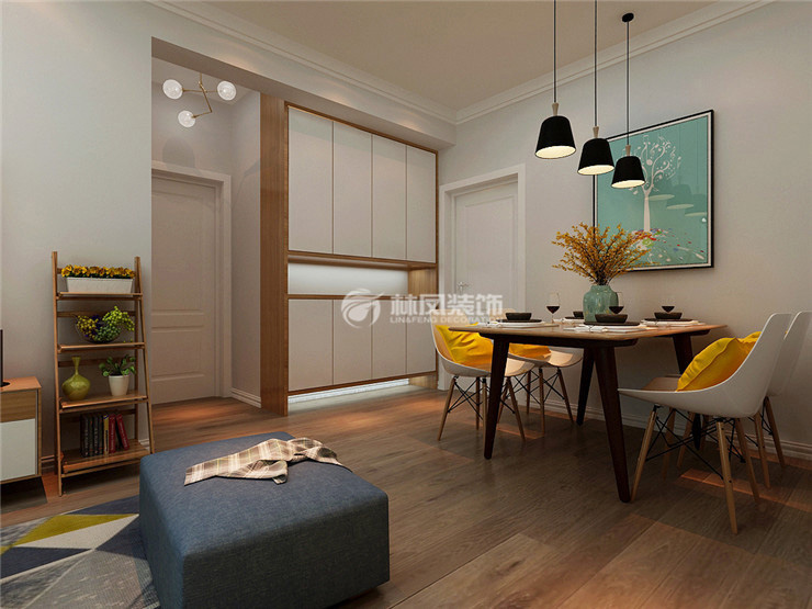 以簡單個性不失北歐風(fēng)的餐廳,自在隨性的餐廳小垂吊燈,在延續(xù)溫馨色調(diào)心情的客廳,餐廳不失光采亮黃色的餐椅靠包與餐掛畫形成鮮明的對比,而不失生活趣味,用餐更有情調(diào),不規(guī)則的奶白色實家具與原木色的家具相結(jié)合,入戶鞋衣柜在餐桌的映襯更獨立不失神秘之感。