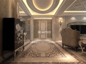 本案的風(fēng)格是的新古典風(fēng)格。材質(zhì)運(yùn)用護(hù)墻板的深淺邊線對比,搭配硬包金屬鋼條拉縫來做主元素,在運(yùn)用墻面以及地面的淺啡網(wǎng)拼花和墻面理石的協(xié)調(diào)運(yùn)用,來打造一個(gè)充滿低調(diào)奢華的典雅新古典主義風(fēng)格。