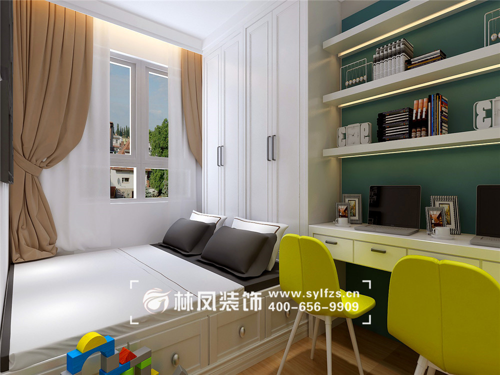兒童房兼書房的榻榻米臥室,整體是以白色柜體為主,在配飾與裝飾上一樣選擇了跳色藍(lán)色和黃色搭配,顯得整個(gè)空間沒有那么沉悶與壓抑感。也體現(xiàn)出了年輕的氣息。