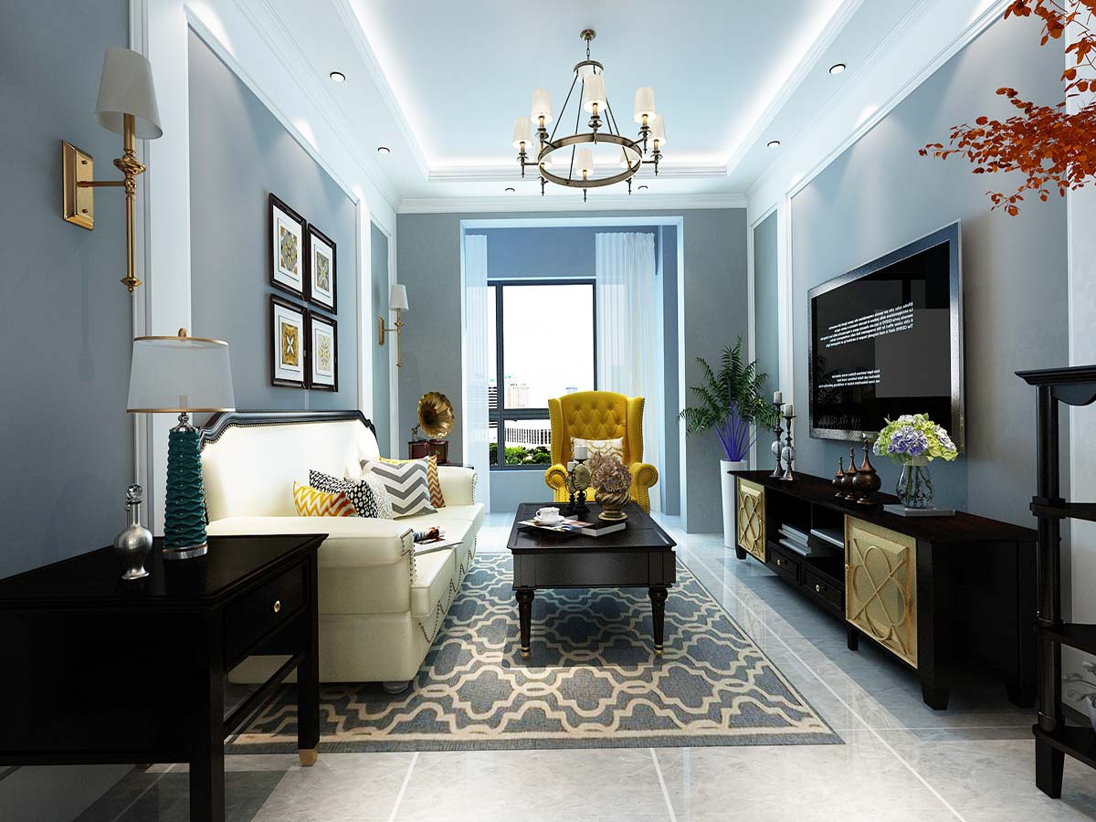 (圖為林鳳裝飾富禹?依云藍(lán)灣123㎡戶型美式風(fēng)格客廳裝修案例)
