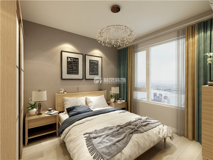 臥室空間的用了一個比客廳灰度更高的灰色做背景墻,原木色的家具搭配清新的綠色和黃色,讓空間風(fēng)格更加明顯。