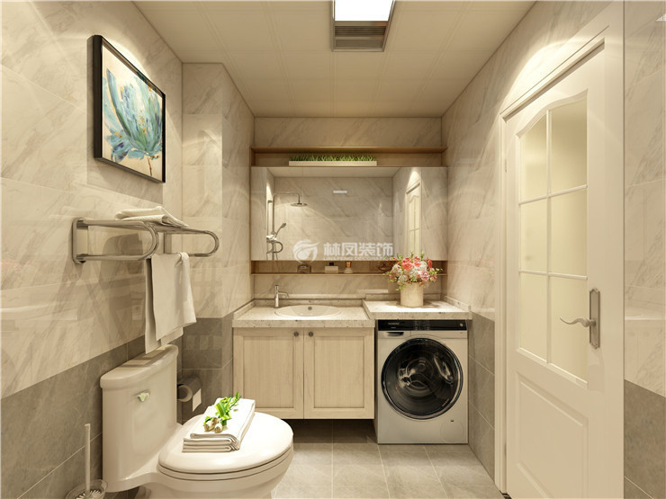 墻面磚延續(xù)了客廳磚的理石質(zhì)感,采用下深上淺的顏色搭配,使空間顏色對比分明,浴室柜臺面做了一個延伸,有更多的平面空間擺放洗漱用品,增加了空間的利用率。