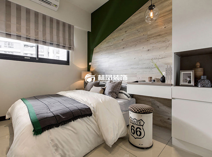 主臥室說明:臥室以使用為主,省掉一個(gè)床頭柜,以書桌和書架相結(jié)合。背景墻采用了木色以及墨綠壁紙想相結(jié)合,點(diǎn)綴整個(gè)空間,使空間變的富有生機(jī)。次臥說明:預(yù)留男孩房間,床頭背景墻已裝飾架和書桌相結(jié)合,即增加了儲(chǔ)物空間又添加了空間的靈動(dòng)性。