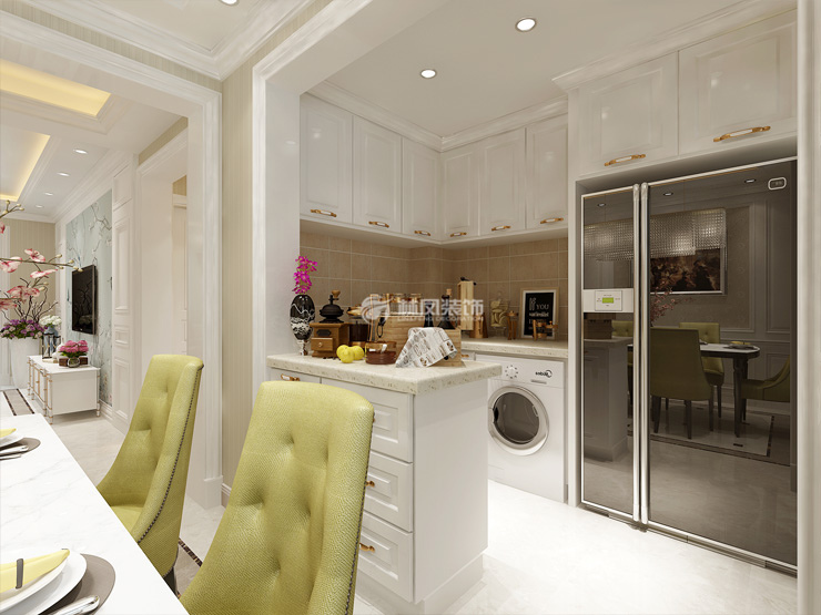 碧桂園銀河城天墅120平3居室美式風(fēng)格林鳳裝飾的廚房采用開放式整體櫥柜設(shè)計,以合理利用空間。暖色大理石的臺面與象牙白櫥柜相統(tǒng)一,配以古典花型的拉手,彰顯著現(xiàn)代廚房設(shè)計的時尚新主張