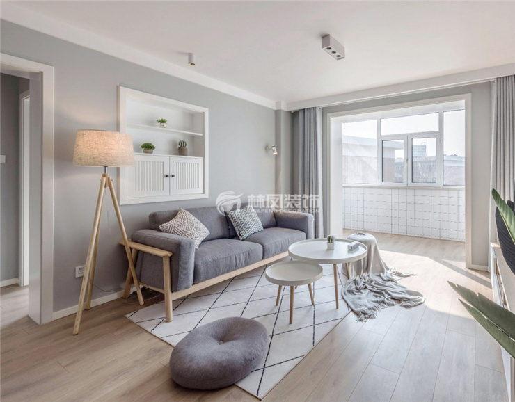 金石名悅89平2居室北歐風(fēng)格林鳳裝飾的客廳墻面暖灰色,柔和清新,讓空間沉浸在一種放松舒適的狀態(tài)之中。白色茶幾等的加入讓空間更顯純凈與美好。