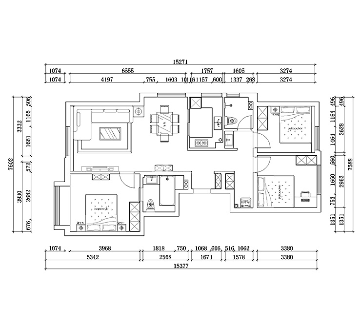 三室兩廳一廚兩衛(wèi),高層整體采用美式風(fēng)格,色調(diào)以深色為主,體現(xiàn)美式的居家感和溫馨感。