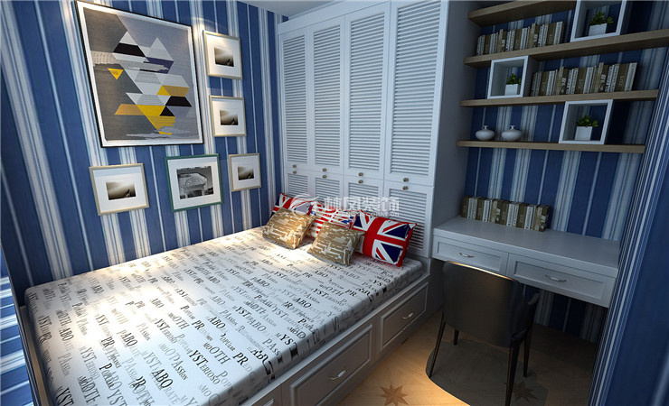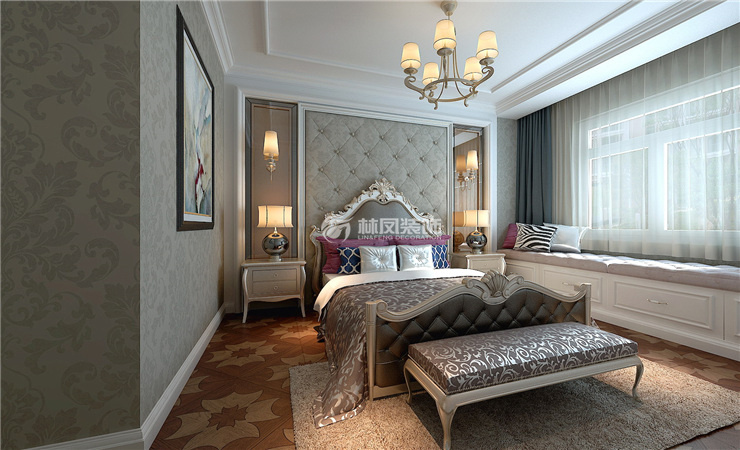 【主臥室說明】由于主臥室空間比較寬闊,我們在窗前設計了一個飄窗柜,并在飄窗柜上鋪上軟包墊,使飄窗柜有多了一個卡座的功能,閑來無事在卡座上讀讀書,度過一個愜意的午后。背景墻用軟包與金色茶鏡的搭配是整個臥室的點睛之筆,茶鏡的金色與軟包的米色為完美的暖色搭配又不失歐式奢華的調調。在加上歐式經(jīng)典的角線,奢華的床品完美打造出了溫馨又浪漫的居室。