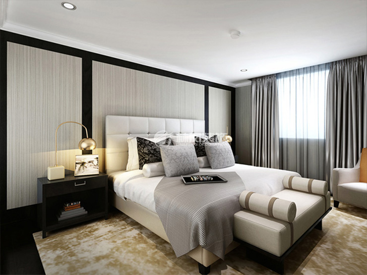 中海國(guó)際社區(qū)185平4居室現(xiàn)代混搭風(fēng)格林鳳裝飾臥室空間更是以柔軟的壁布作為整個(gè)空間的主要使用材質(zhì),讓黑白灰不再顯得冰冷。照明方面使用了無(wú)主燈設(shè)計(jì),簡(jiǎn)約的平棚內(nèi)嵌了幾只柔和的暖光筒燈,亮金色的臺(tái)燈作為整個(gè)空間的點(diǎn)綴提升了此環(huán)境的品味與格調(diào)。
