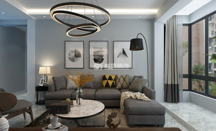 融城時(shí)代101平2居室現(xiàn)代風(fēng)格林鳳裝飾的客廳淺灰色地磚將總體餐廳客廳廚房連貫效果??蛷d沙發(fā)灰色布藝風(fēng)格,搭配其他色彩靠墊,提高空間色彩,沙發(fā)包裹感墻,給客戶帶來舒適感。