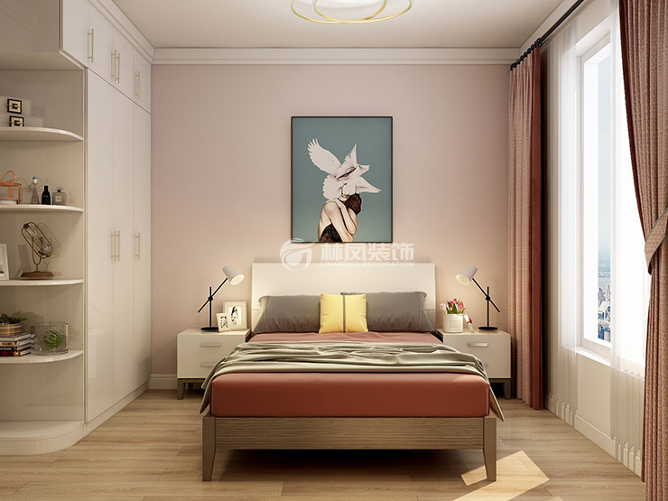 臥室床頭采用粉色背景,配合粉色窗簾,完全展現(xiàn)業(yè)主的一顆少女心,在這種氛圍中休息完全是一種享受。