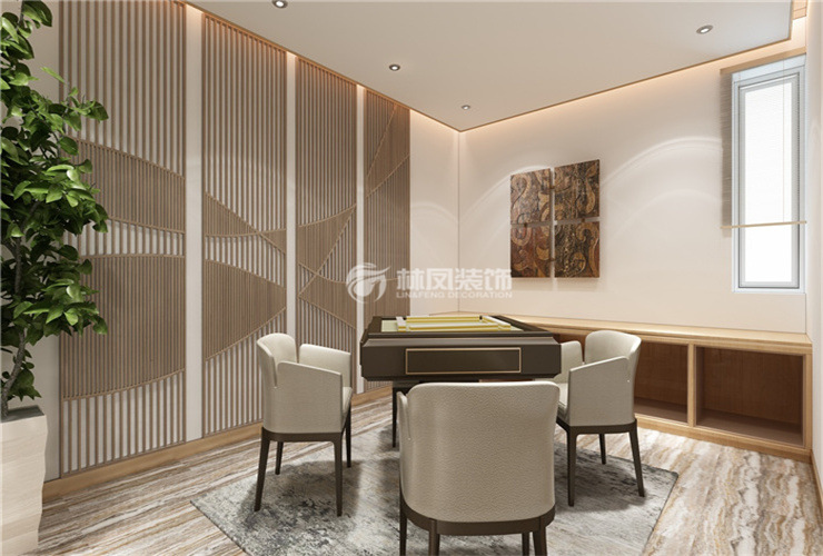 棋牌會館340平混搭風格林鳳裝飾的大廳以暖黃色為主,為了給客人一樣賓至如歸的感覺。墻面幾何造型非常具有現(xiàn)代感,臺球桌裝飾效果明顯,不拘泥于傳統(tǒng),別出心裁。