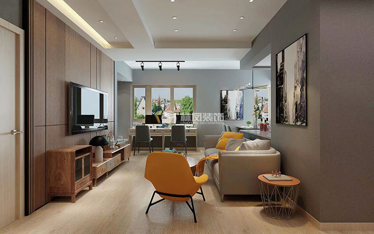 樂天圣苑122平三室兩廳現(xiàn)代極簡風(fēng)格林鳳裝飾的客廳家具上選擇了灰色的布藝沙發(fā),搭配靠枕黃橘色的配飾作為點(diǎn)綴,木質(zhì)的茶幾,背景墻采用了木質(zhì)木板色,配上現(xiàn)代木色的電視柜,顯得簡單大方。