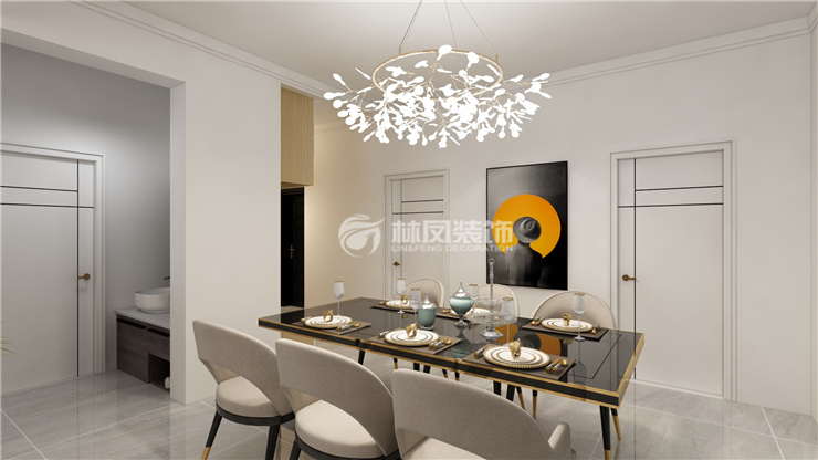 金輝優(yōu)步湖畔115平四室兩廳現(xiàn)代簡約風格林鳳裝飾的餐廳區(qū)域選用了深色系的餐桌和餐椅,餐桌邊緣有金色的金屬線條讓餐廳起到了畫龍點睛的感覺,讓餐廳看起來更加的精致,暖色系的燈光給人食欲,在餐桌的墻上掛了一副以黑色金黃色的裝飾照片使整個餐廳空間與客廳銜接的更加完美。