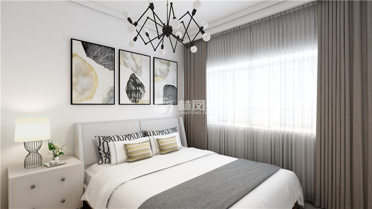 金輝優(yōu)步湖畔115平四室兩廳現(xiàn)代簡約風格林鳳裝飾的臥室是休息的地方業(yè)主不喜歡太鮮艷的顏色,喜歡質(zhì)樸的感覺,臥室棚面采用了石膏線造型地面選擇了鋪貼灰色地板,臥室空間以灰色白色為主,墻上畫龍點睛的掛畫與臥室的床和衣柜顏的色彩都以灰白為主,風格更加的統(tǒng)一。
