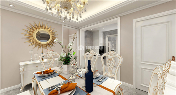 金地樾檀山180平四室兩廳歐式風(fēng)格林鳳裝飾的廚房分為中廚和西廚,中廚采用拉門,使得空間更加寬敞明亮,在顏色的選擇上,整體以白色為主,和客廳的色系整體呼應(yīng),達到良好的視覺效果。