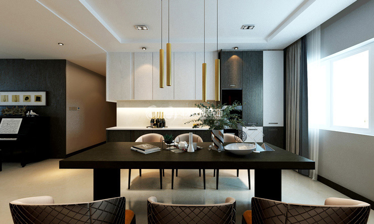 匯景新世界198平四室兩廳現(xiàn)代風(fēng)格林鳳裝飾的餐廳的設(shè)計(jì)呼應(yīng)的客廳的設(shè)計(jì),棚頂也是采用圈棚和平棚結(jié)合設(shè)計(jì),簡(jiǎn)單時(shí)尚的餐吊讓餐廳空間增加一些動(dòng)感,餐桌的選擇是在1.8米長(zhǎng),6-8人日常聚會(huì)或者吃飯都沒有問題。