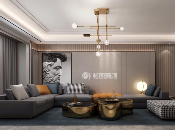 華發(fā)全運(yùn)首府113平兩室兩廳現(xiàn)代輕奢風(fēng)格林鳳裝飾的客廳,整體空間的材質(zhì)、線條、色彩搭配、比例構(gòu)成經(jīng)過了用心 考究,客廳的墻面材質(zhì)一明一暗 ,一虛一實(shí) 對(duì)比協(xié)調(diào) 沙發(fā)抱枕和窗簾清亮的橙黃色做點(diǎn)綴 就像對(duì)光的向往 意式休閑沙發(fā) 靜謐低調(diào)內(nèi)斂。