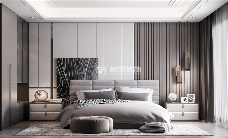 月星國際120平三室兩廳現(xiàn)代風(fēng)格林鳳裝飾的臥室光線從窗進(jìn)入臥室,舒適只有通過氣氛去營造。