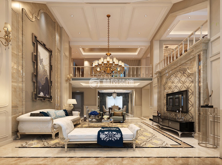 海城新東方240平四室兩廳簡(jiǎn)歐輕奢風(fēng)格林鳳裝飾的客廳是挑空的,沙發(fā)背景采用了整面石材背景,彰顯了奢華大氣,新東方古典氣息的沙發(fā)大氣沉穩(wěn)又不乏高級(jí)感,斜頂采用了白石膏頂處理留白了頂部空間,營(yíng)造了高挑的效果,電視背景墻同樣采用了石材,跟沙發(fā)背景形成了互動(dòng)。